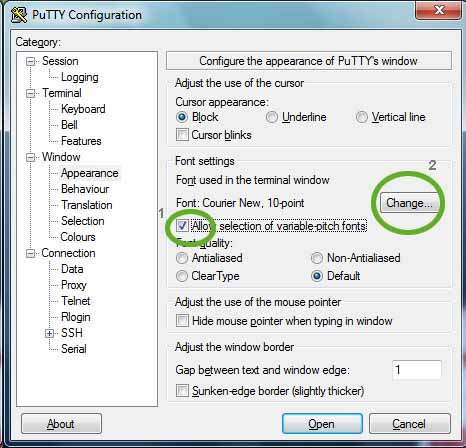 • Ensuite Sélectionnez Category/Windows/Appearence, cochez tout d'abord le choix [x] Allow selection of variable-pitch fonts, et cliquez sur le bouton [Change...].