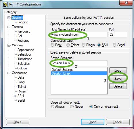 • Ensuite Sélectionnez Category/Session, Entrez votre Nom de domaine ou IP pour Host Name (or IP Address). Donnez un nom pour Saved Sessions), ici Session Linux, cliquez sur le bouton [Save...].